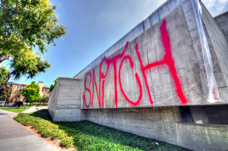 ‘The huge dripping “SNITCH” tag on the exterior of the brutalist concrete Berkeley Art Museum exterior was my first sign that this was going to be a truly great exhibit. Among all the visual sensory stimulation, at our first introduction I was impressed with Barry’s attention to his guest. In the crunch of finalizing the installation to open in a few hours, Barry was calm and generous with his time allowing me to shoot without restrictions.