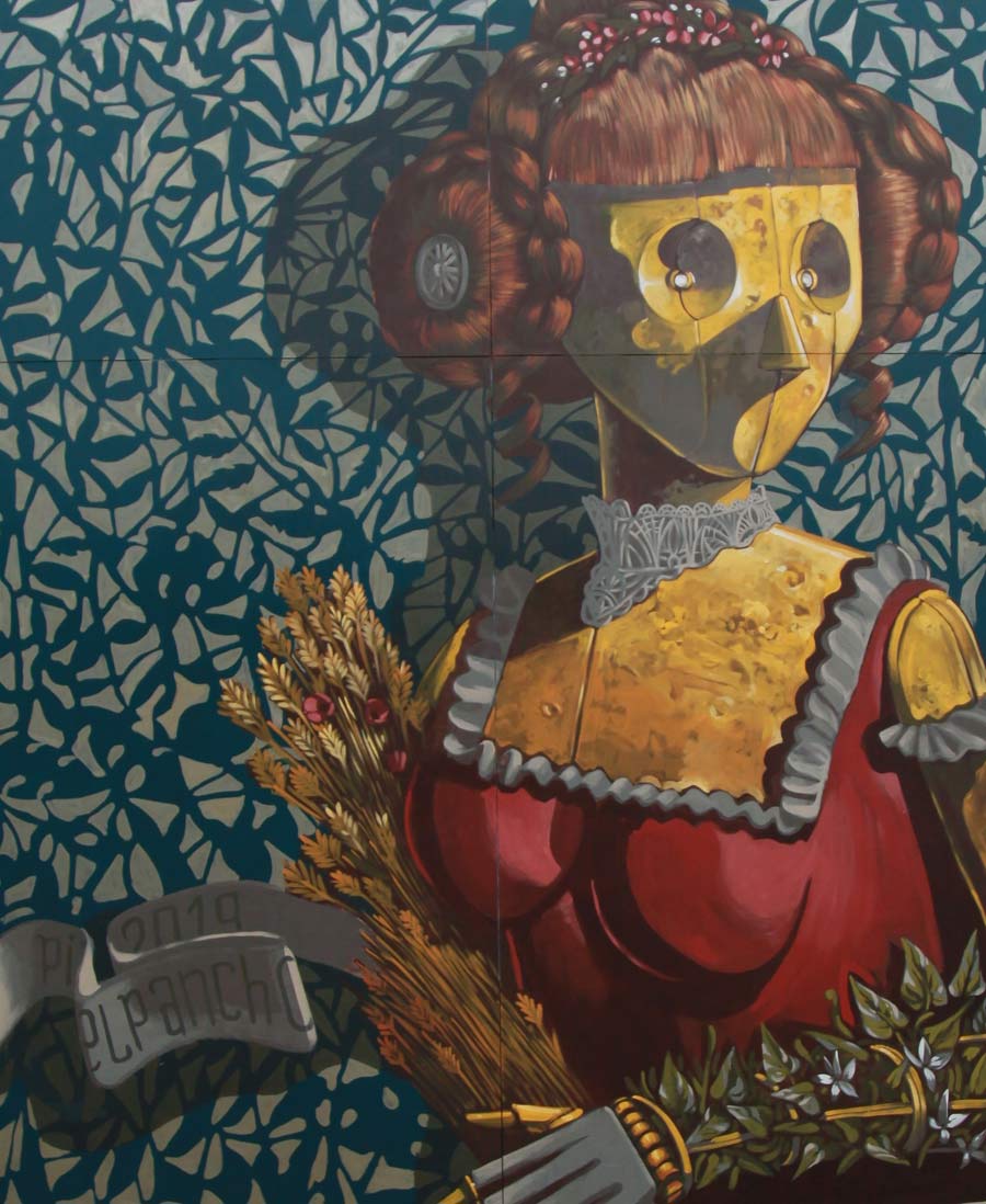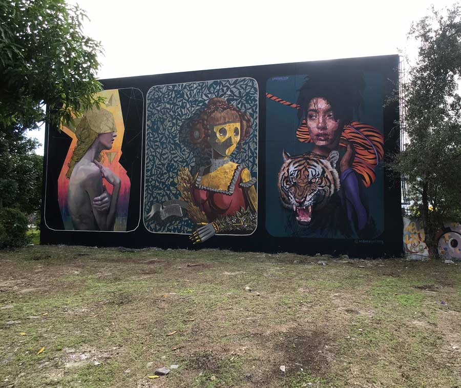 From Bosch to Beckmann to Bacon the multi-paneled presentation of the barnacled and beatific has commanded the attention of art fans for centuries. Here on a backlot in the swampy section of Miami that’s now known for public painting, we find a trio of uniquely stylized female sitters, one slightly more robotic than her flanks. In a darkly storied and neglected neighborhood now painfully clamoring for attention, it was this partially obscured wall that adroitly captured ours.