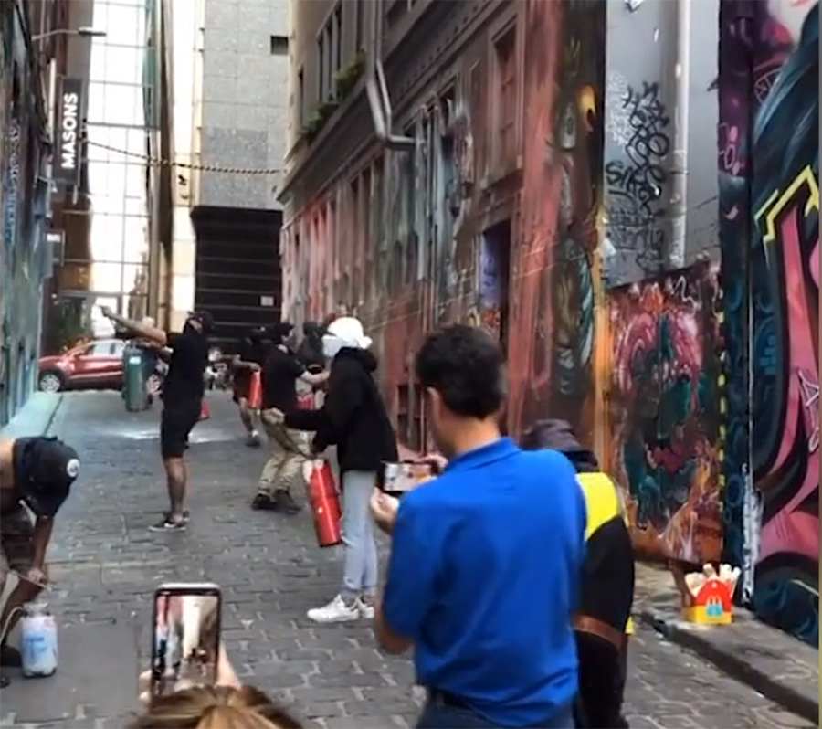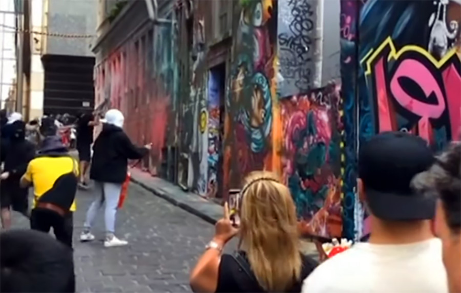 As you watch footage of this mismatched team of what appear to be white young male (and female?) sprayers in comfortable footwear quietly annihilating the sanctioned Street Art and murals on Hosier Lane, it strikes you that it was an appreciative crowd of onlookers who happily recorded them on their phones. Beyond the light whir of propellers keeping the camera drone over your head, also recording, that popping noise you hear in your mind may be the metaphorical sound of heads exploding all around the urban art world.