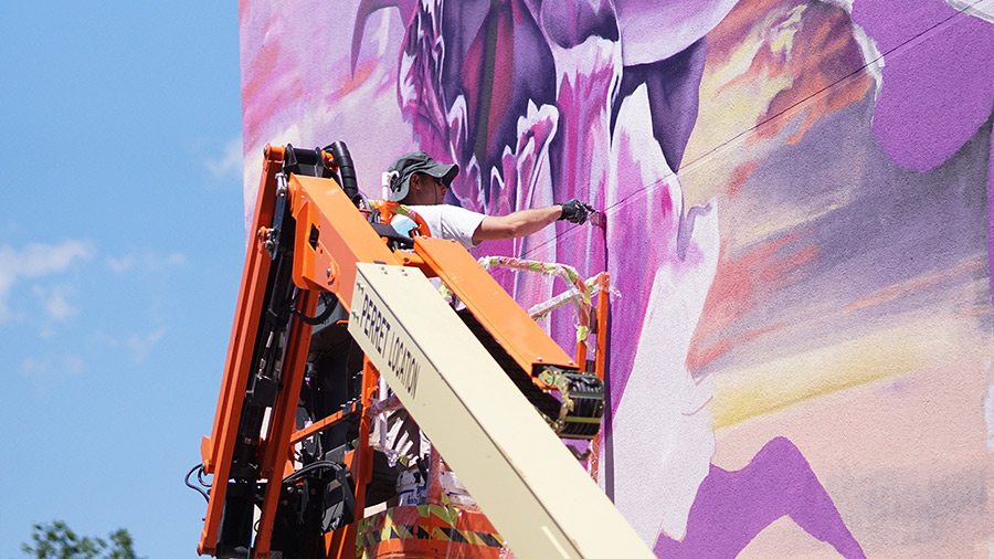 In the current edition in Saint-Martin-d’Hères, we see a new piece by Italian botanist and illustrator Fabio Petani, who rather brilliantly incorporates the landscape of the majestic Alps directly into his background multi-story mural called Silicon Carbonate & Cattleya Mossiae. At once richly detailed and mistily atmospheric, his sophisticated rendering must have been inspired by the enchanted beauty of the region.