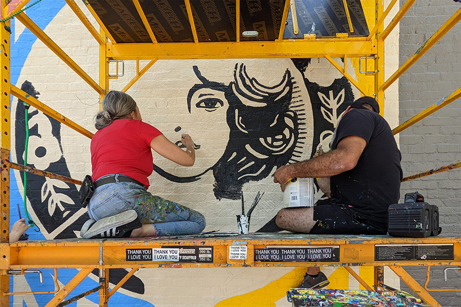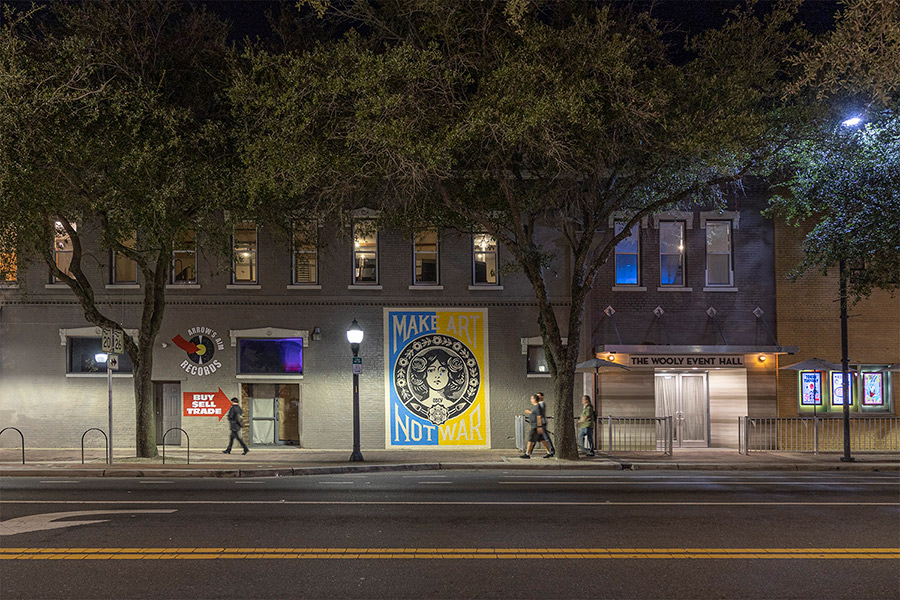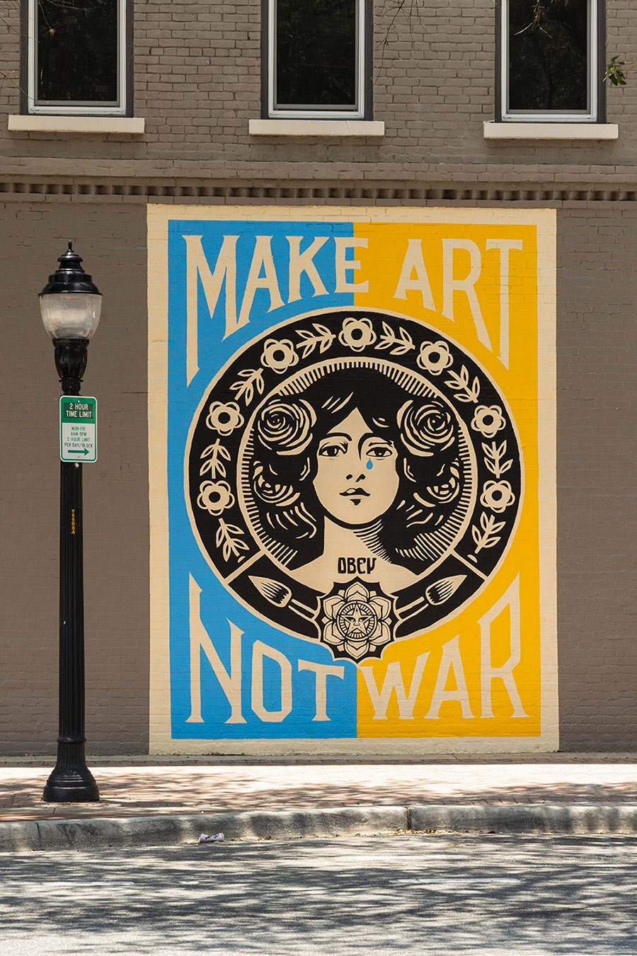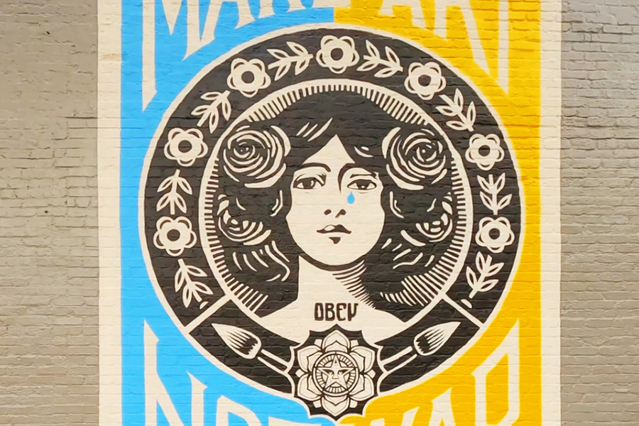 Visionary Fam, a team of local artists from Gainesville, Florida, have completed a new mural by street artist Shepard Fairey, thanks to an initiative by local street art curator Irina Kanishcheva. The native of Lviv, Ukraine, has been looking for an opportunity to express solidarity with Ukrainians during the current war with Russia. With Fairey’s imprimatur, the team recreated one of his recent classic designs, now interpreted with the yellow and blue Ukrainian national colors.