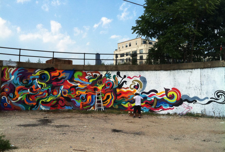 If you get to Boston to see this show and this large mural, make time in your trip to see the brothers other works in less obvious locations to get a greater appreciation for their history growing up as teens in the mid 80s while pouring over books like “Subway Art” and seeing the hip-hop and graffiti scene from New York spreading around the globe. You’ll find a mural at the Revere Hotel on Stuart Street and a piece they did along with a handful of friends in Union Square in Somerville at Mama Gina’s Pizza. Among the other contributors to that piece were RIZE, Coyo, and Caleb Neelon.