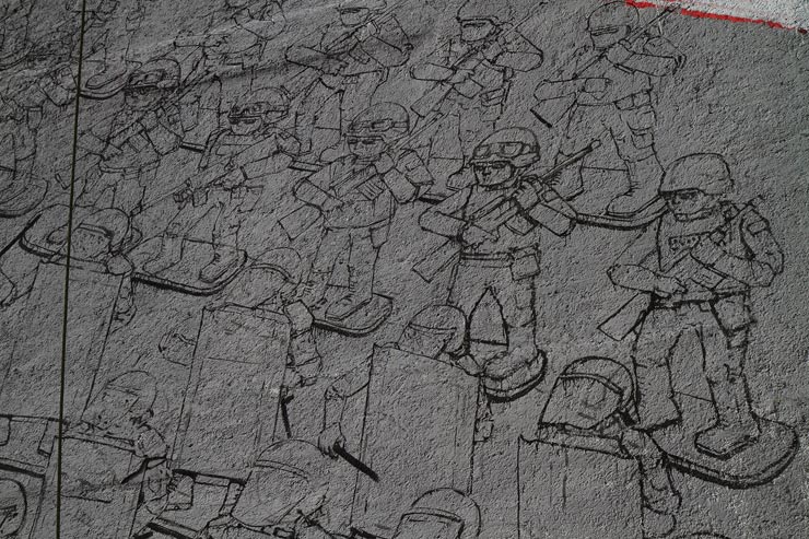 No stranger to controversy, the largely anonymous Italian BLU has similarly featured the banded colors of the Mexican flag in his mural but with bluntly acidic criticism – with the green appearing as dollars, the white as lines of cocaine, and the red a dripping liquid similar to blood. Framing the flag are military figures standing guard.