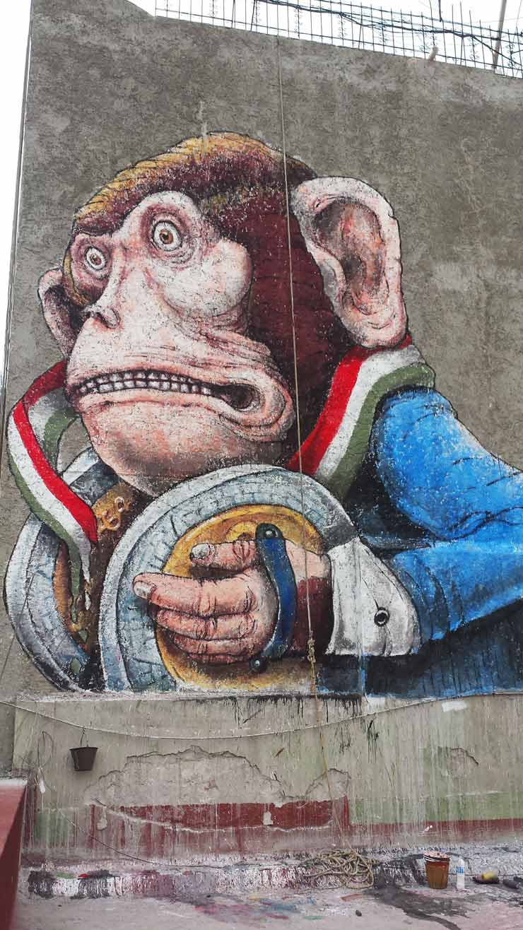Based on the response to the mural by Italian Street Artist EricaIlcane, however, “Manifesto” may be running into resistance against certain artistic speech, and censorship has suddenly appeared . The ribbon around the neck of a cymbal-banging monkey originally contained the colors of the Mexican flag but has now been painted black. The monkey was overlooking a street in a part of town central to political marches, and Ocampo says it “is always a very ‘sensitive’ part of the city.”