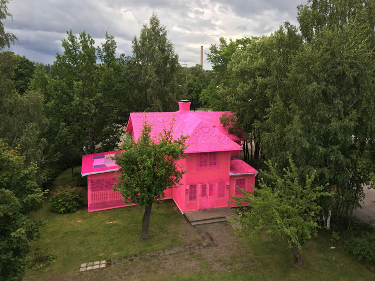 We first called her the Christo of Street Art a number of years ago, and this latest project seems to finally confirm it. Olek created a two part installation for the Verket Museum in Avesta – in short it is about destruction and rebuilding. Above is the latest picture of the house she mounted the installation within – wrapped in meters and meters of pink crochet.