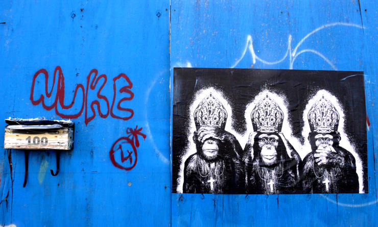brooklyn-street-art-k-guy-jaime-rojo-11-10-3-webK-Guy’s recent “Primates” piece, including this one that appears to be pretty fresh, have been appearing around Brooklyn suddenly. Apparently its meaning is reference to the growing perception of hypocrisy in the Catholic church, particularly as pertains to pedophilia coverups, its position on contraception, gay rights, among other issues.  brooklyn-street-art-k-guy-jaime-rojo-11-10-12-web