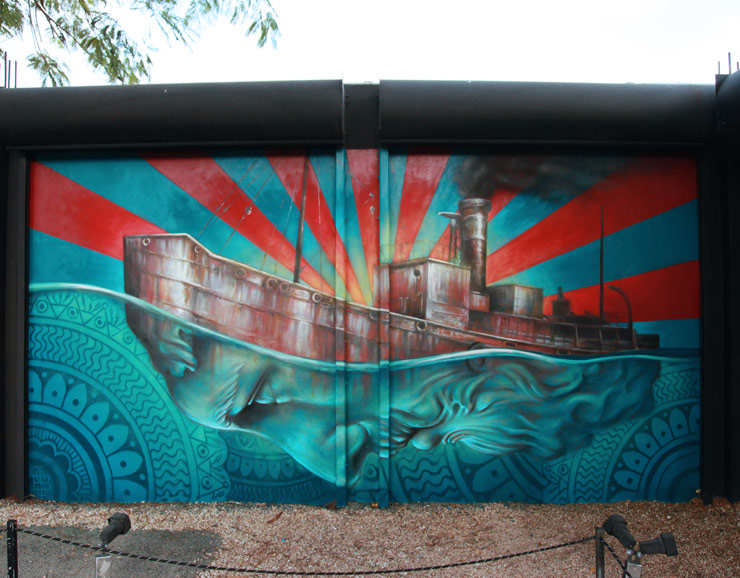 Brisbane-based realist Fintan Magee has been nailing tall walls around the world this year with technical precision and an extraordinary appreciation for our ordinary lives. We had the privilege of seeing him in action in Scotland, Sweden and Tahiti this year and each time we realized that he’s undaunted by the scale of a job, in love with the process of painting. He is also completely dedicated to speaking to the profound issues of our time including global warming, sea levels rising, our refugee crises worldwide, and natural resource preservation and management. Carrying the water theme, Fintan shares with us one of his favorite pieces of the year in Instanbul.