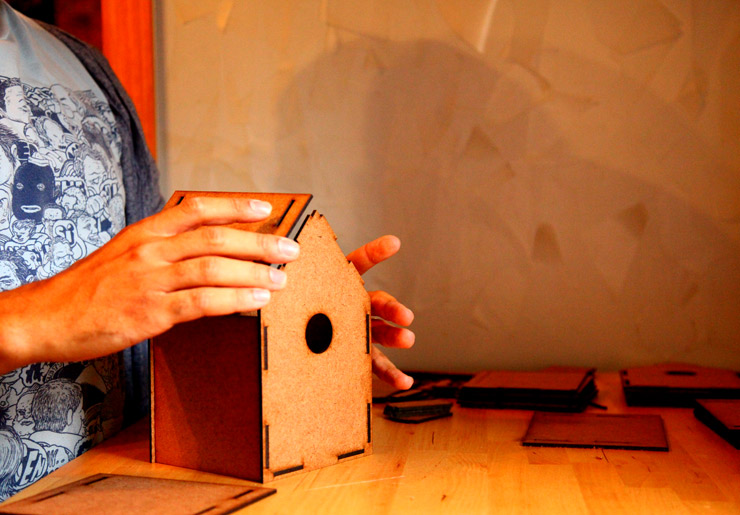 He points to his years as a student as pivotal in his development as a thinker and artist today. That’s probably why his design, materials, and technical discipline can stand up to academic rigor, but it won’t completely explain why these bird “dwelling units” have a satellite dish for television reception, a solar panel on the roof powering a night light, nor the certain minimalist elegance overlaying it all. Clearly XAM is a Street Artist for more than just the bird watchers and one worth keeping your eye on.