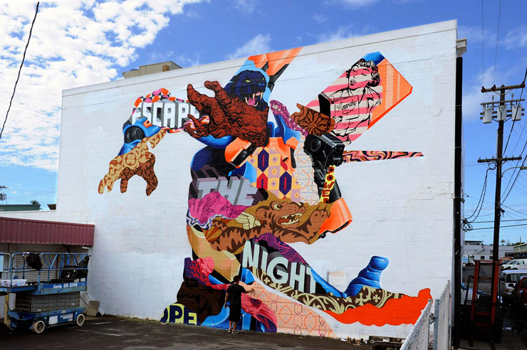 Today we jump right in to the warm Honolulu waters for a swim before padding barefoot up to the painted walls of Pow! Wow! where photographer Martha Cooper is waiting camera in hand and looking for a fly swatter to smack down a camera drone that is buzzing around her head and getting in the way of her shots.