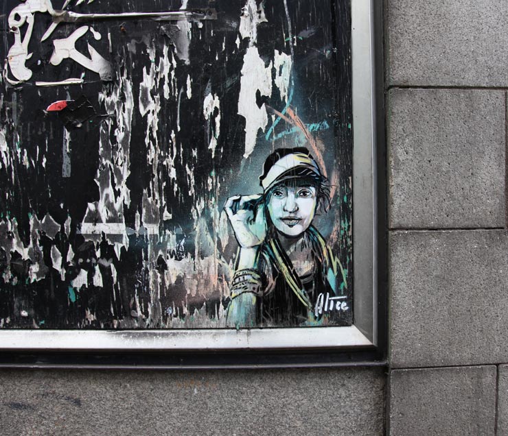 Germany’s Herakut dominates one concave wall of Aberdeen Market overlooking “The Green” with their improvisational blending of illustration style portraiture, textual flourish, and symbols germane to the city. De Casabianca chose images form the Aberdeen Art Gallery of two children – haunting in a narrow street known by local folklore for ghosts of children who were sold as slaves to America in previous centuries.