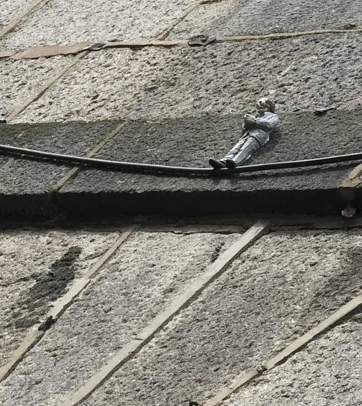 Belgium’s Jaune peppers doorways and electrical boxes with multi-layer stencils of fluorescent-vested municipal workers in humorous scenarios. These are partnered in scale by small grey-suited and somber businessmen by Spain’s Isaac Cordal, which are hidden before your eyes and camouflage into the daily city until you discover one standing on a ledge, balancing on an electrical line, or sitting atop a CCTV camera.