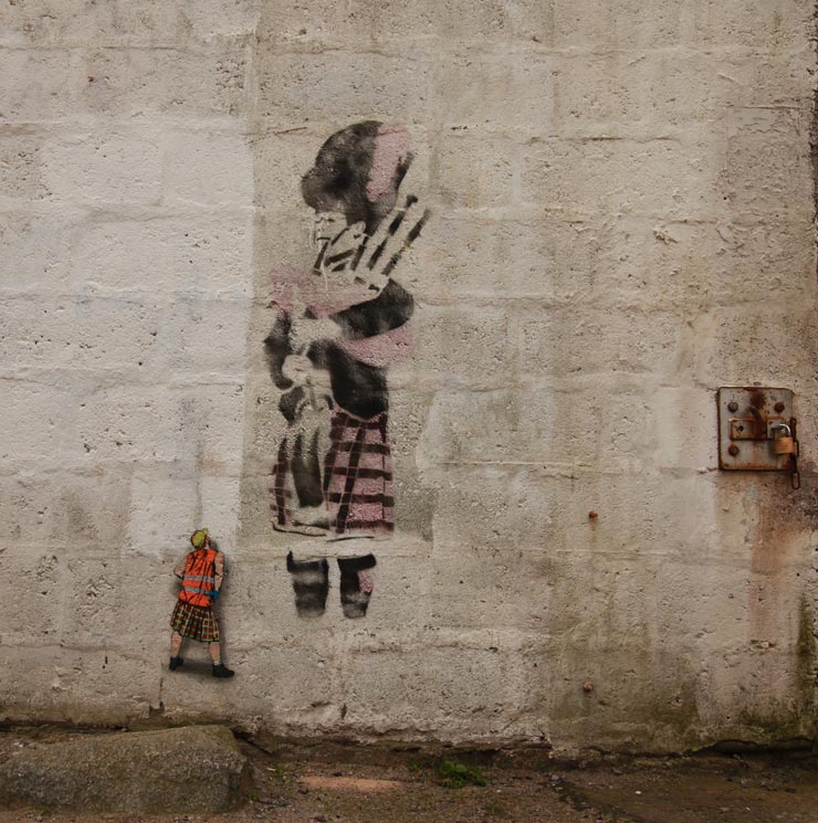 When it comes to Nuart Aberdeen the people whom we met are nearly exuberant in their responses, even awestruck by the appearance of this new art in their city. With the introduction of aerosol, brush paint, wheat-paste, stencils, miniature sculpture, and poetry to street walls, it is as if a hidden pent-up desire for art in the public sector has burst open, a geyser if you will.
