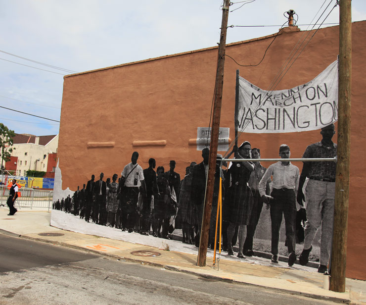 Street Artist J R opened his first US solo exhibition at the Contemporary Arts Center (CAC) in Cincinnati in September and today we have some images of his assistants and volunteers making installations of the work. Running through February, the exhibition features more than a decade’s worth of work done in public space including photography, video projects, sculptural installation, and wheat pasted images. As he did during his Times Square visit this spring/summer, J R will have a mobile photo booth housed inside a van to drive around the greater metropolitan area for people to have their photograph taken and to possibly be wheat-pasted in Cincinnati’s Fountain Square.