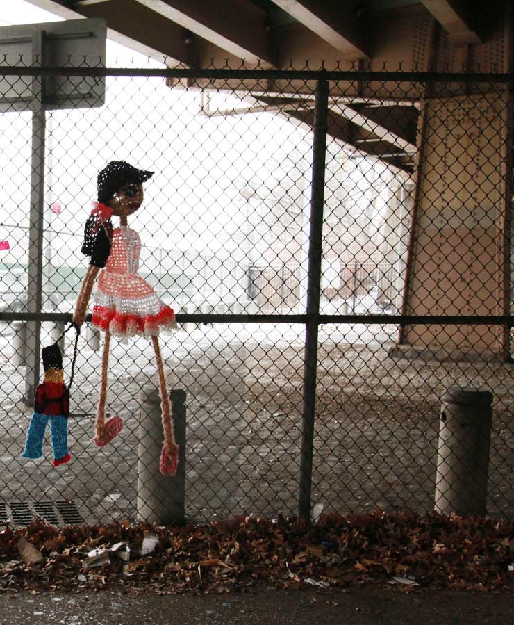 Knitting and crocheting for the street is hardly new, but it is experiencing a great surge of interest right now – to the thrill of some who find it adorable and cute, and to the utter disgust of graffiti and Street Art dudes and dudettes who think it is all a trifle – not hardcore or STREET enough to be allowed up on walls and fences or on the, uh, STREET.