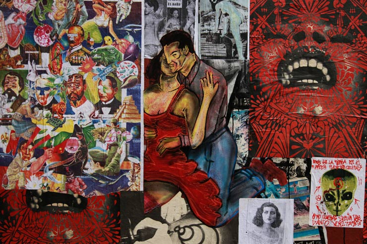 Detail of a wall with a variety of wheat pasted art. Artist(s) Unkown, though we think we see Stinkfish in there. (photo © Jaime Rojo)