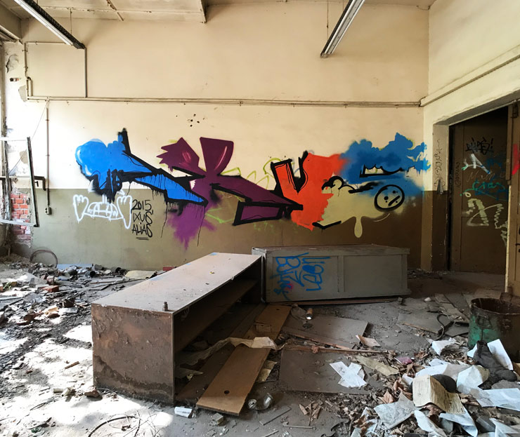 Whenever we travel to a new city as guests for academic talks on Street Art, art curating, or just seeing festivals and exhibitions we make it our priority to visit the forgotten margins of the industrial environs; spots where creativity and loose talk can happen uncensored, without permission and absent considerations of financial gain. The abandoned, decaying buildings like this one serve as a laboratory for many artists around the world, presenting an unintended studio environment and university function for artists who are experimenting, discovering, refining their skills.