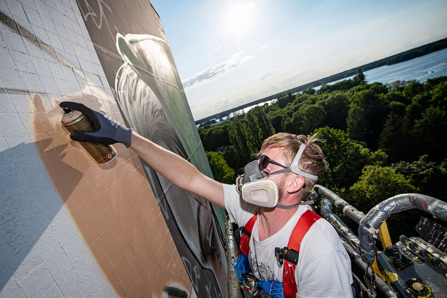 “I was digging through images of camps and prisoners for a few days,” says Westergard of his search for the right image for this 2 meter wide, 6-story high wall in Berlin.