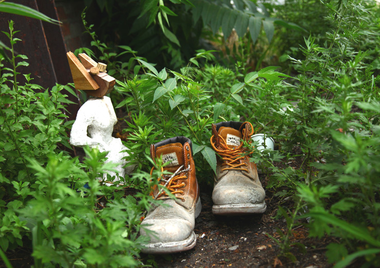 An Unknown artist’s mix media sculpture plus a pair of discarded boots = Street Still Life. (photo © Jaime Rojo)