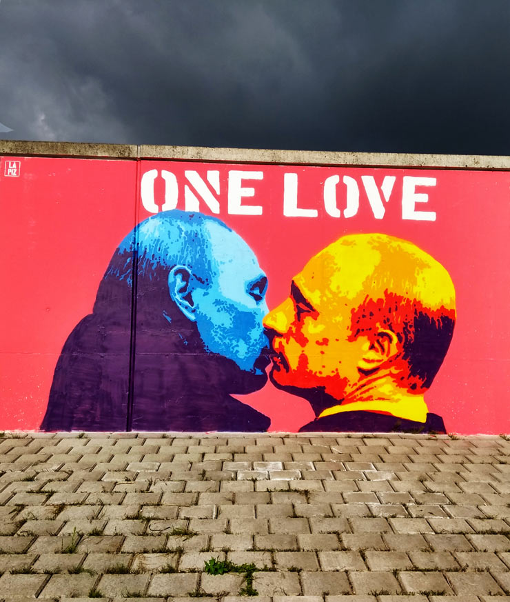 The motive shows the Russian president Vladimir Putin kissing Vladimir Putin. The colours are those of the rainbow flag and it has the words ‘One Love’ written above it. The picture addresses Putin’s narcissism and even more the homophobic tendencies supported by the Russian