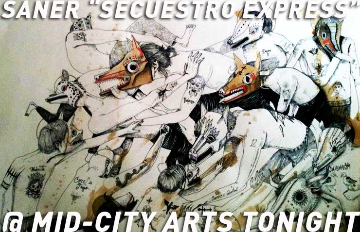 Also in Los Angeles tonight, Mexico City Street Artist SANER presents a solo show, Sequestro Express”, addressing how organized crime stages flash kidnappings south of the border.