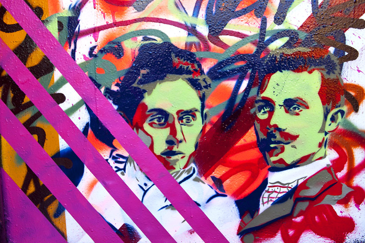 Using a reliably greyscale, white, and acid green palette, LUDO’s high-tech hybrids are alternately frightening and amusing, and even super cool. While a Freddy Kruger facemask is obviously symbolic, it’s pairing with a mechanical daisy is unnerving. The wheat paste of a tarantular top-loaded missile delivery device is laughable until you see the video of unstoppable multi-limbed all terrain “big dog” robots being developed to do the same thing. Even the bunch of grape skulls seems sort of blunt until you think of what we’re now learning about irradiation, pesticides, and genetically modified foods. Taken as a whole LUDO’s work is one of the more message-driven on the street today and is another example of the new narrative-driven story telling we continue to witness in Street Art. Luckily, it’s also visually compelling.