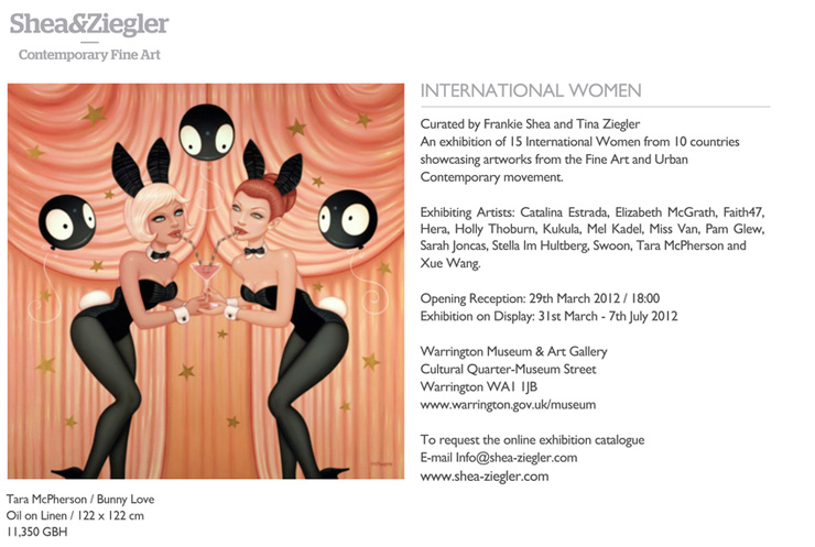 Following the success of ‘Gossip Well Told’ group exhibition that launched the first Warrington Contemporary Arts Festival, Frankie Shea & Tina Ziegler return to Warrington Museum in March with an exhibition called ‘International Woman’. In conjunction with Moniker Projects, ‘International Woman’ brings together a stellar roster of more than 15 artists from 10 countries, being the first exhibition in the UK that highlights the cross-over of the Pop Surrealism and Urban fine art movements under one roof. Working in underground art movements these women have forged names for themselves by pushing the boundaries of contemporary art, experimenting with new mediums, ideas and visual concepts. Individually they have enhanced the overall direction of these underground movements, and as a collective they have changed the way women are viewed in urban culture today.Exhibiting artists: Catalina Estrada, Cheryl Dunn, Elizabeth Mcgrath, Faith 47, Hera, Kukula, Mel Kadel, Miss Van, Pam Glew, Sarah Joncas, Stella Im Hultberg, Swoon, Tara Mcpherson and Xue Wang.Curated by Frankie Shea and Tina Ziegler