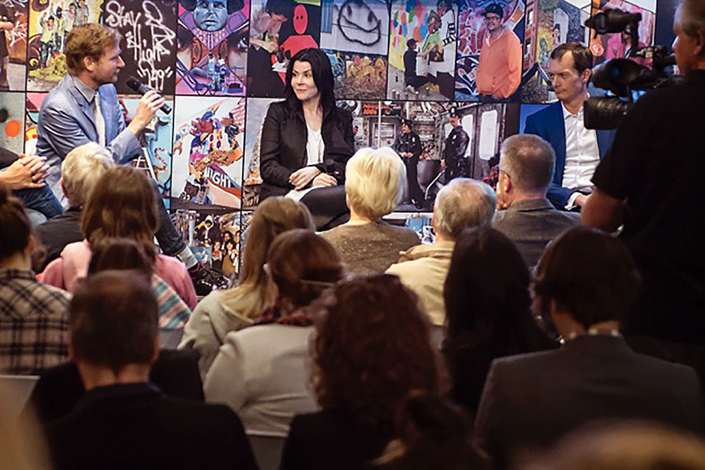 With a wall full of photographs by the renowned Martha Cooper behind her and before a roomful of press people and artists, the manager and future director of the museum gave this sweeping overview of the philosophical approach that has breathed life into a project that is her brainchild. Along with Markus Terboven from the Gewobag foundation, Thomas Willemeit, Managing Director at architect GRAFT, Tim Renner, the Undersecretary of State for Cultural Affairs, and Hendrick Jellema from the non-profit Berliner Leben, Ms. Young laid out the plans for the dynamically designed interior of this Wilhelminian-era building at Bülowstrasse 7.