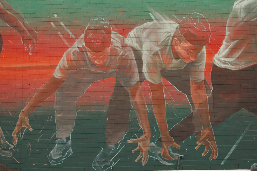 Using his language of transmuting forms progressing along a visual timeline, here Li-Hill slightly alters the faces of local kids to preserve their anonymity and captures the forms in kinetic movement from left to right.