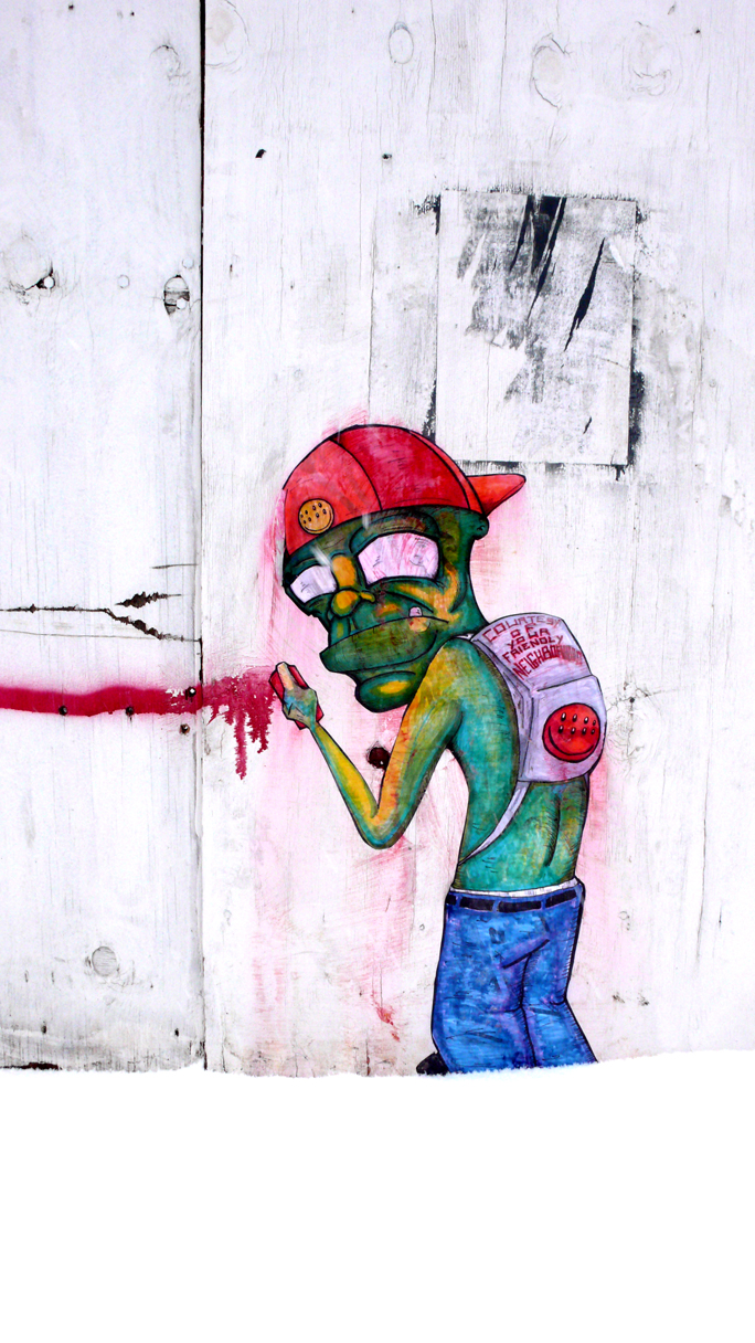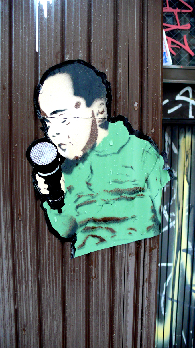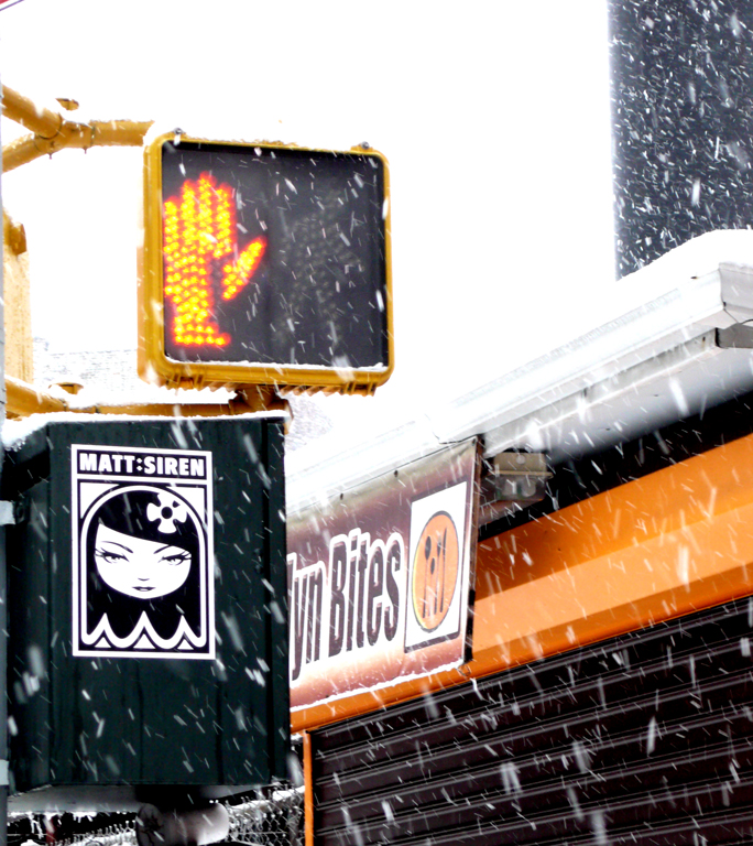 On Tuesday I found the roll-up gates to the Deli on the corner of Bedford and N. 7 closed. Located in the epicenter of rapidly gentrifying Williamsburg, I've not seen the gates ever down once since the 1990's. Besides the revelation of seeing the piece by Anthony Lister for the first time, I was a little confused to see it closed. Then I saw the cluster of lit candles and vases of flowers on the sidewalk by the entrance, and I learned that Al, the hard-working warm and friendly owner of the deli had passed away. Suddenly it was with sadness that I took this photo. Even though these images aren't specific to him, we dedicate this weeks images to Al, who really liked the street art in the neighborhood, and welcomed the artists who brought this neighborhood to life. Al was an example of what can make Brooklyn neighborhoods great - an open-hearted gentle and kind guy; he always had a moment to talk and joke with you and was always ready to help you with whatever you needed in his shop. R.I.P. Al and condolences to his family and friends. (photo © Jaime Rojo)
