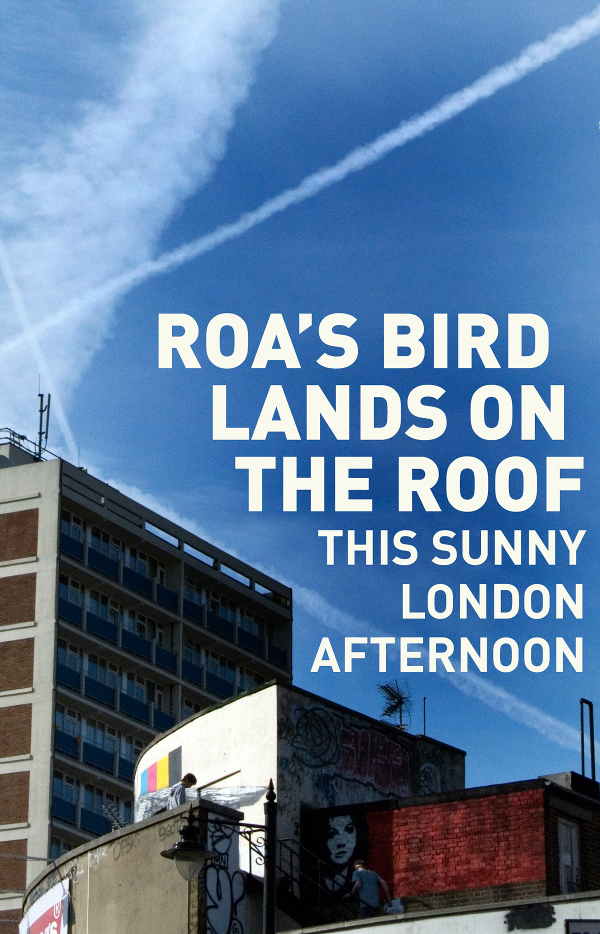 In town for his smash solo show that opened this week at Pure Evil Gallery , street artist ROA flew to a nearby rooftop to install some sort of long-beaked bird. Thanks to eagle-eye photographer Sarah Didry, we can see the scene as it takes flight right now under sunny London skies.