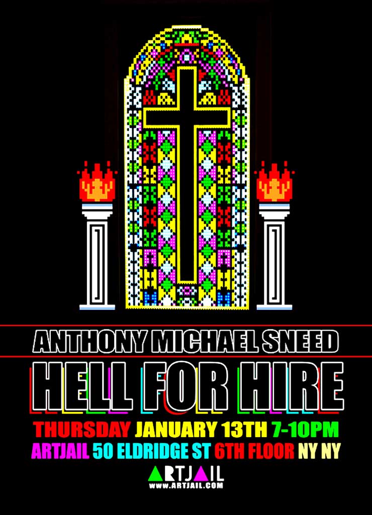 Anthony Michael Sneed is an emerging artist who will be having a pop-up show at ARTJAIL in NY this Thursday January 13th from 7-10. his exhibition entitled “Hell for Hire” is the culmination of work that has spanned over two years time. Embodying numerous mediums from canvas to Legos, and varying themes from JFK to the KKK, Sneed has amassed an impressive collection of work not only in scale but in content.