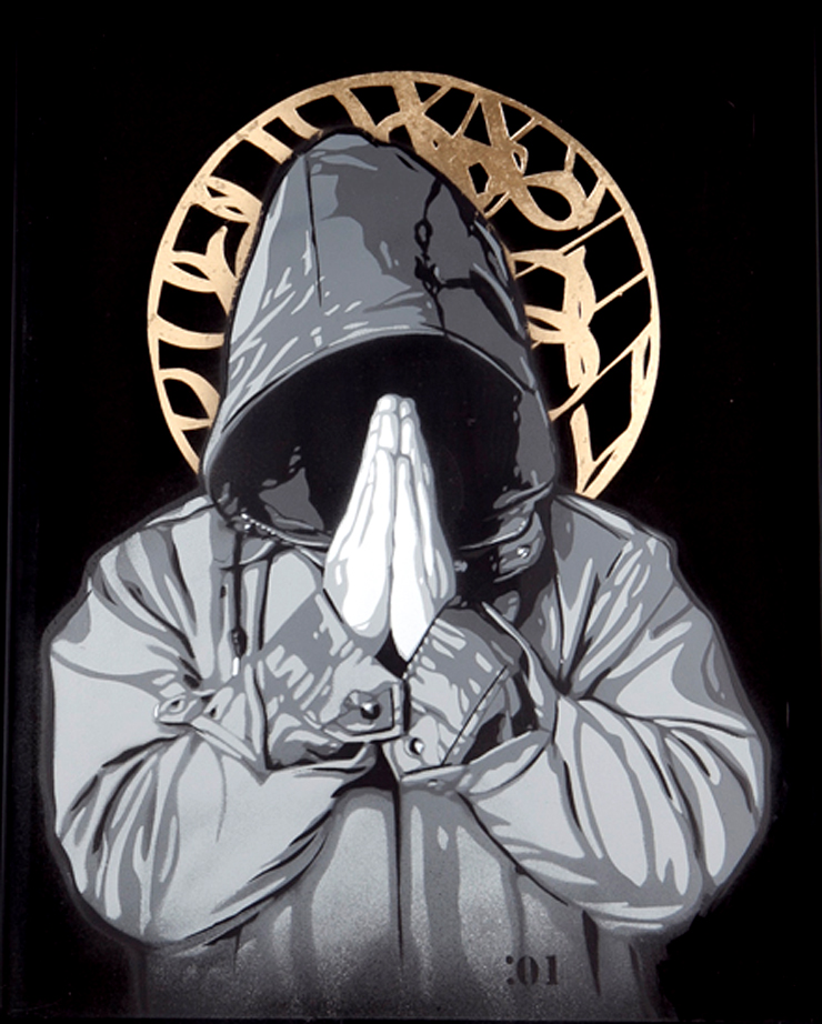 The work for Street Artist and fine artist Joe Iurato uses stencil as it’s central technique, and the human figure and gesture as a means of expression. For his dual show with Shai Dahan opening tomorrow at Vincent Michael Gallery in Philadelphia, Iurato expresses a turbulent time in his recent life when he battled economic insecurity, deep rooted fears, and feelings of low self-esteem. For “Salvation” the artist contemplates his relationship with his religious faith, and he questions the strength of it’s foundation and his life.