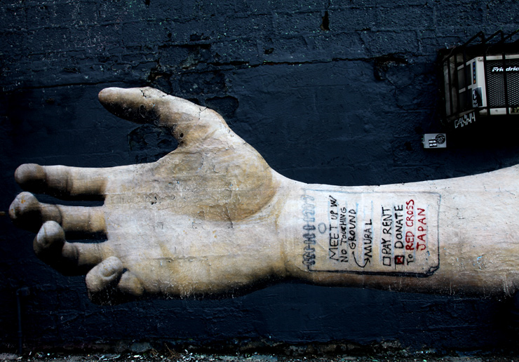 It was a list of things to do that I wrote on my real hand and then sprayed on this larger-than-life hand. I added a new note on the list: DONATE TO RED CROSS JAPAN. I then left one note undone: PAY RENT. I hoped this subtle prioritizing would get people to question how much they really could help.”
