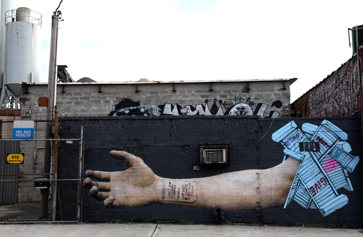 Amazing new work has been appearing around New York by Street Artist Overunder for about a year and a half. An illustrator, painter, and text writer – the styles are quite varied and intermixed and the themes are often symbolic, fantastic, and blurred. One recent piece, a large scale realistic collaboration with a street artist named No Touching Ground, is a memo-pad tattooed arm with a short list to accomplish, finished with a cluster of rollup gates. While the wall was permissioned, the rain was not and it complicated matters for the two artists. In fact, weather is always a component in the work of the street.