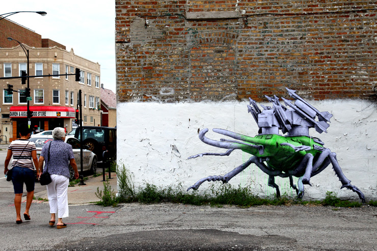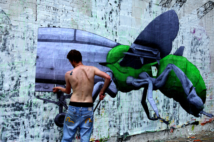 Parisian Street Artist LUDO brought “Nature’s Revenge” to the US this month and his eye-popping surreal wheat-pasted creations are now on walls in New York, Chicago, and Los Angeles. By combining weaponry with insects and plants into hybrids, LUDO is using this ongoing series to draw attention to how we are messing with nature in ways we never have in an unquestioning way and at our own peril. From biotech to nanotech to robotics to remote controlled drones, the face of war is sold with branding and a sizzling “wow” factor, accompanied by vague assurances that these developments are necessary to protect us good guys from the bad ones. From the perspective of this ongoing “Nature’s Revenge” series, our romance with all things shiny and futuristic is quickly morphing out of our control and it’s likely to come back and bite us, or worse.