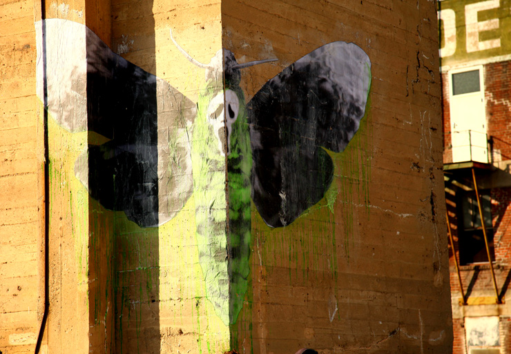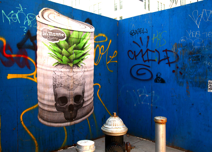 Using a reliably greyscale, white, and acid green palette, LUDO’s high-tech hybrids are alternately frightening and amusing, and even super cool. While a Freddy Kruger facemask is obviously symbolic, it’s pairing with a mechanical daisy is unnerving. The wheat paste of a tarantular top-loaded missile delivery device is laughable until you see the video of unstoppable multi-limbed all terrain “big dog” robots being developed to do the same thing. Even the bunch of grape skulls seems sort of blunt until you think of what we’re now learning about irradiation, pesticides, and genetically modified foods. Taken as a whole LUDO’s work is one of the more message-driven on the street today and is another example of the new narrative-driven story telling we continue to witness in Street Art. Luckily, it’s also visually compelling.