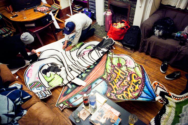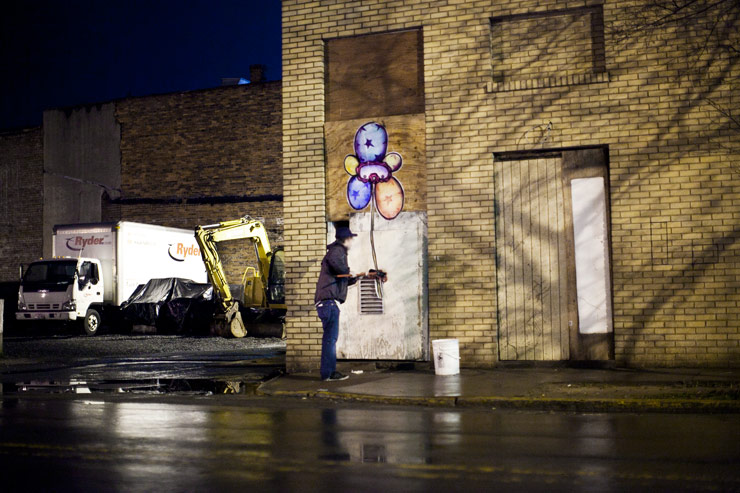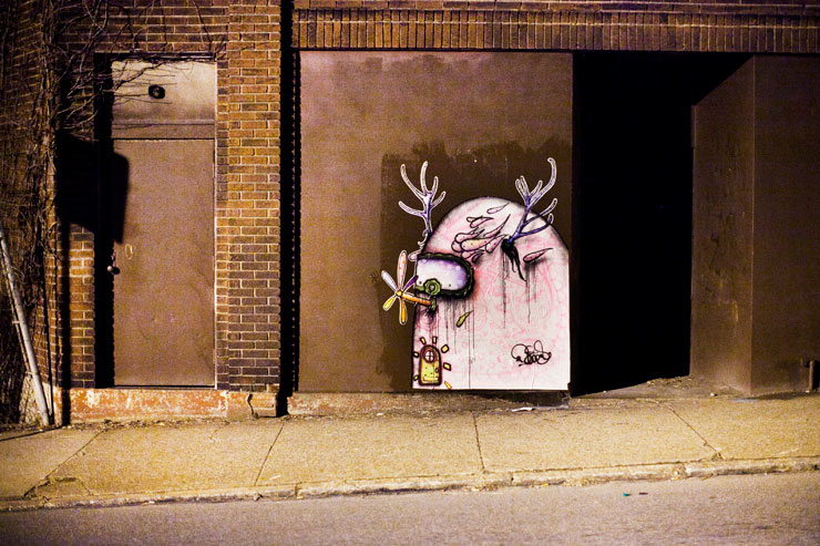 Street Artists Nice-One and Lucx did some painting and wheat-pasting recently in Cincinnati and Savannah as part of a special student arts themed tour they took out of their native Chicago. Their complementary illustrative styles are thoughtfully whimsical, colorful, and sometimes satiric. The collaborations here captured by Chicago based photographer and BSA contributor Brock Brake give you a sense of some artists lustful focus on so-called “appropriate placement”, or putting the work where it functions with a bit of harmony in its context.