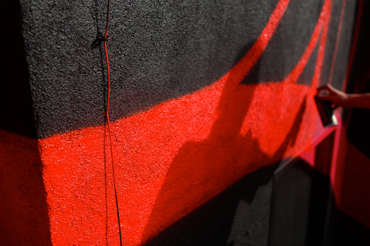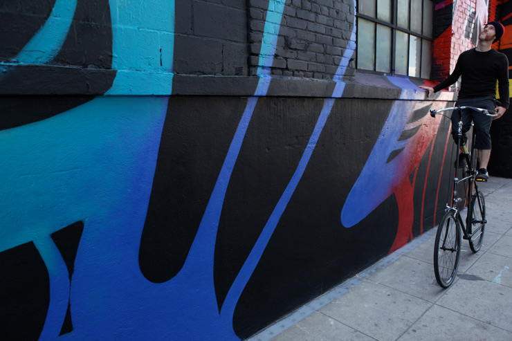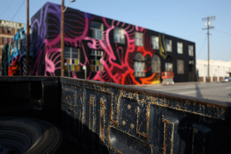 The point is California is a quintessential long-ass big-ass state that rivals many entire countries in terms of the size of the overall economy, the miles of beach, quantity of Mexicans, and metric tons of silicone injections. That’s why it hardly surprises us when Daniel Lahoda reports that recently his LA Freewalls project crossed the 100th wall mark and that INSA just completed the biggest project so far. Clocking in at 9,300 square feet, the Street Artist covered more space with paint than the Kardashian sisters use preparing for a poolside photo shoot. But these results are spectacular and the scale is quite fitting for this city.