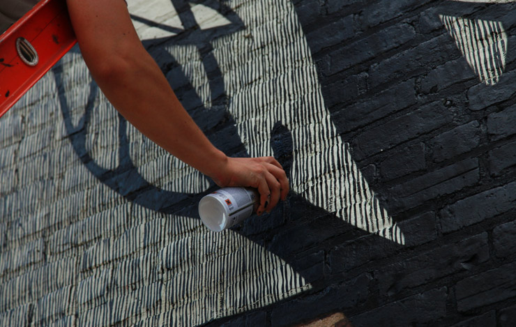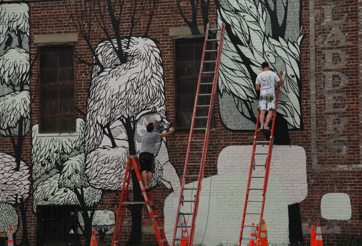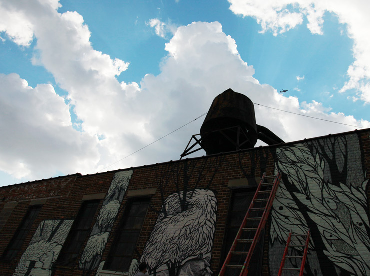 Feliks and Vadim, with the help of Brooklyn based Street Artist Specter, secured a wall in Bushwick as part of the Bushwick Five Points murals. BSA caught up with the artists as they were still at work on their wall. Here are some process shots of the 77% completed project as the two guys employ an acutely understated palette, crisply illustrated lines and natural curvilinear forms.