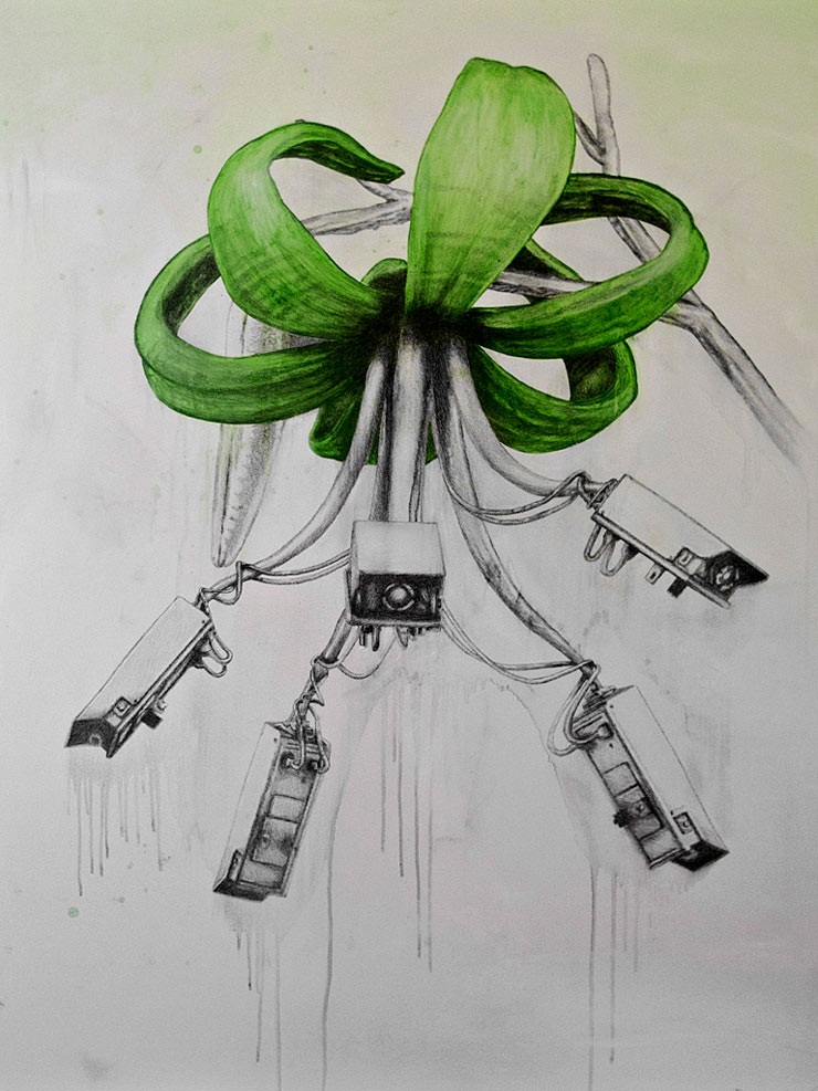 Des caméras de sécurité s’échappent des pistils d’un lis ; les abeilles voltigent, cachées derrière masques à gaz, des crânes humains se regroupent pour former une grappe de raisin.