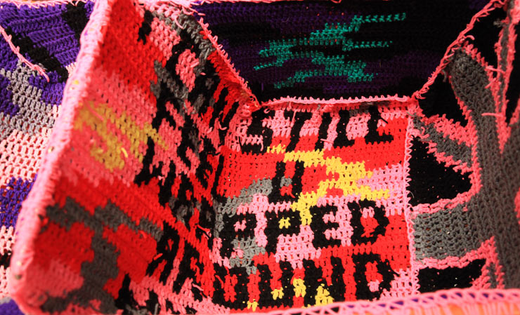 Tricks are for kids, and for Olek, who has reserved one of her raunchy text messages for you to discover crocheted into her sculpture, and for Overunder, who is hanging his free wheeling story-telling metaphors with pattern overlays on large sheets of draftsman paper. It’s also tricky to make your eyes focus through multiple abstractions, line plays, blinding colors, and rippling patterns that jump off at you as you walk through the gallery space.