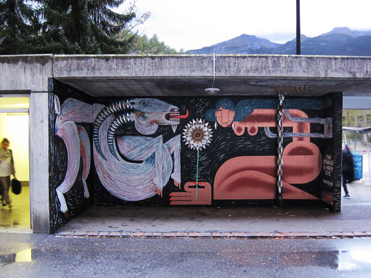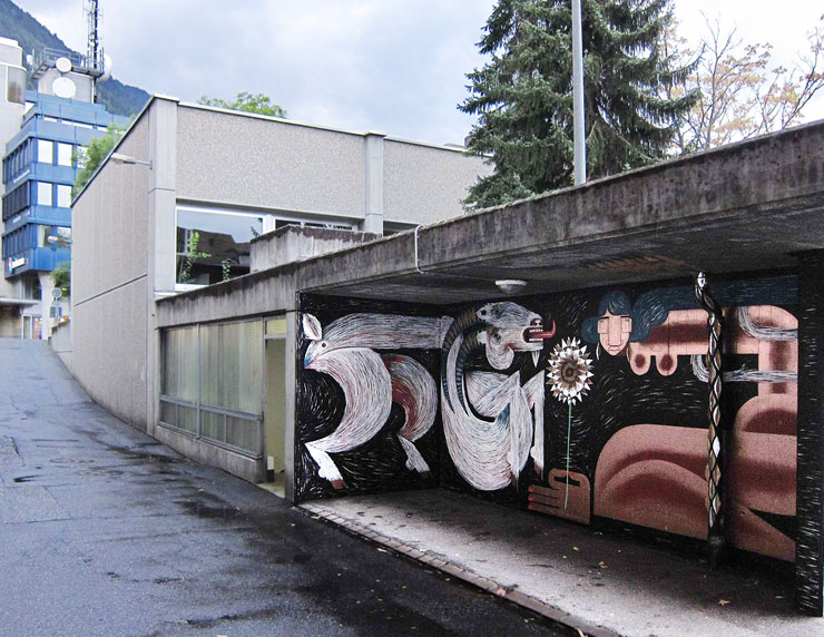 German Street Artist TIKA has been in Chur, Switzerland recently and last week she put up this piece called “Staibock & Hirtin”, which loosely translates to Albine Ibex and his shepherdess. It is a local theme, this heraldic animal, she says, that has a lot of history in this part of the country. She did the entire wall with aerosol, using stencils and some tape for details. She pulled back some of the aluminum tape to give it a relief structure, which is a technique she’s been experimenting with for a few years.