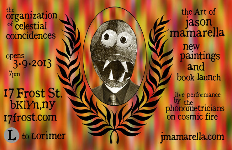 “The Organization of Celestial Coincidences. the Art of Jason Mamarella.” New paintings and book launch “develop your natural psychic abilities. express empathy for all individuals, all species.” at 17Frost Gallery. March 9, 2013, 7pm. 17 Frost Street, Brooklyn, NY. vegan treats, and live performance by The Phonometricians on Cosmic Fire.