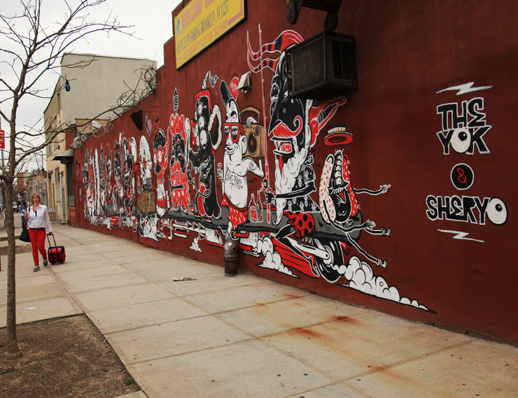 So what did you do on your spring vacation? I know, me neither. But Sheryo and The Yok did and are back in BK after their extended trip that took them to Mexico and Australia where they hit a number of walls on their adventures. Fresh off the plane, they are cracking open the aerosol cans and telling tales about their trips abroad. It seems like in a matter of days they have executed two complete and detailed murals that reveal that their individual styles are sometimes distinct, other times ever-more complimentary on walls in Queens and Brooklyn.