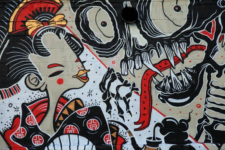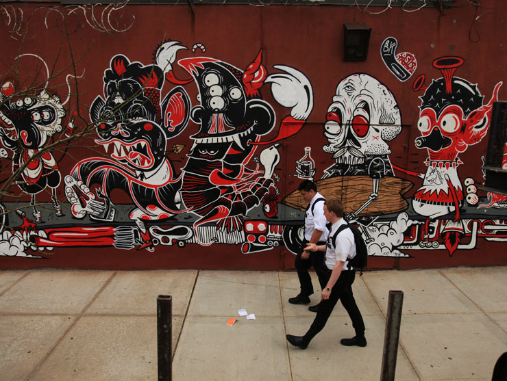 First, in what could possibly be the 5Pointz own version of the upcoming Cherry Blossom season, take a look at “Pipe Dreams”, inspired by traditional Japanese art and calligraphy, with some obvious liberties taken. Afterwards we have a “Road Trip” at the Bushwick Collective, which could be an animated version of the sort of characters they met while tooling around and painting while travelling, and if that’s the case, no wonder they came back!