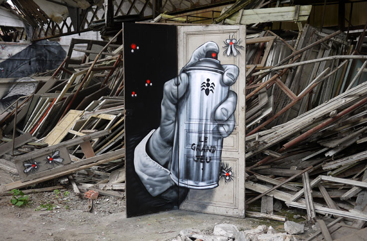 Pictured here are exclusive new images of the multi-panel installation the two artists just finished in an abandoned building in the Reims district of Muizon in France. Appropriate in its context, this is also the birthplace of an artistic movement in the late 1920s called Le Grand Jeu, which serves as an influence for the collaborative tribute.