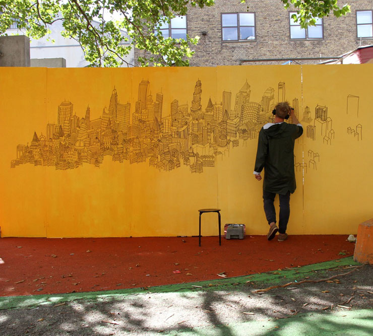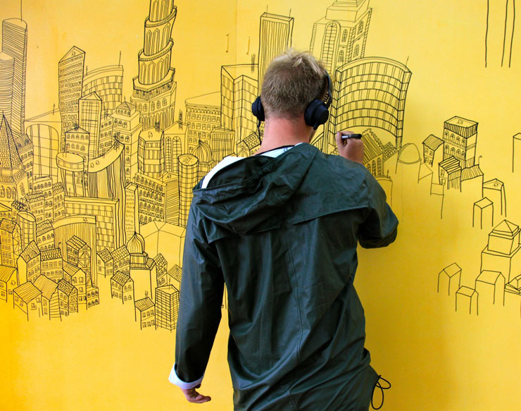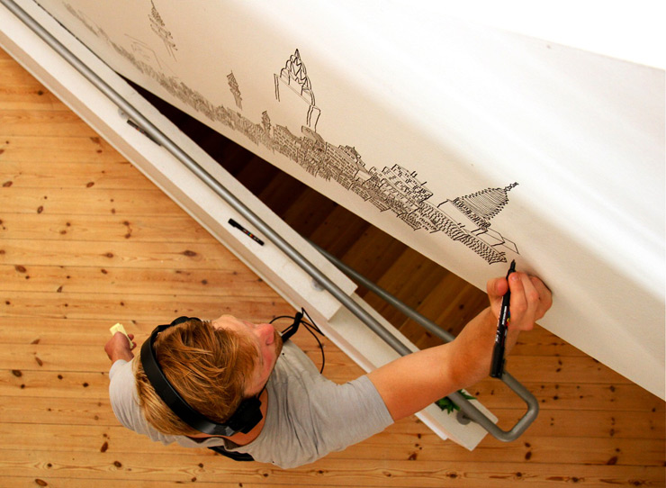 British artist Daniel van der Noon says he likes to travel a lot and see new cities, so maybe that explains why he can’t stop drawing them in all their meticulous complexity across walls, windows, and a variety of other surfaces. At this years Trailerpark Festival in Copenhagen, van der Noon spent hours on an orange wall while music fans poured in and milled about the grounds in search of bands like Micachu, Turboweekend, and When Saints Go Machine. “He specializes in city-scapes which he draws with poscas – and only poscas,” says photographer Henrik Haven, who offers these exclusive shots of the artist drawing his lengthy cityscapes, towers, and the manmade skylines that come largely from his imagination.