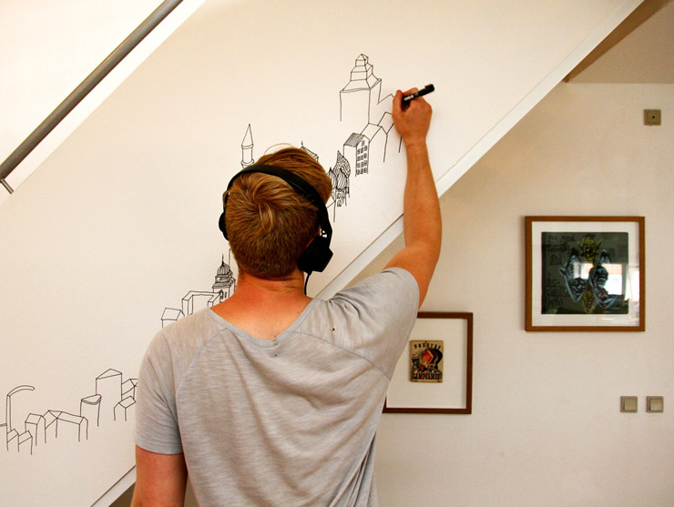 As if to underline with a fine marker the point that he can’t stop drawing, we include a post-party stop for the artist at a private home, where he convinced the owner that they needed a diagonal city climbing up the stairwell.