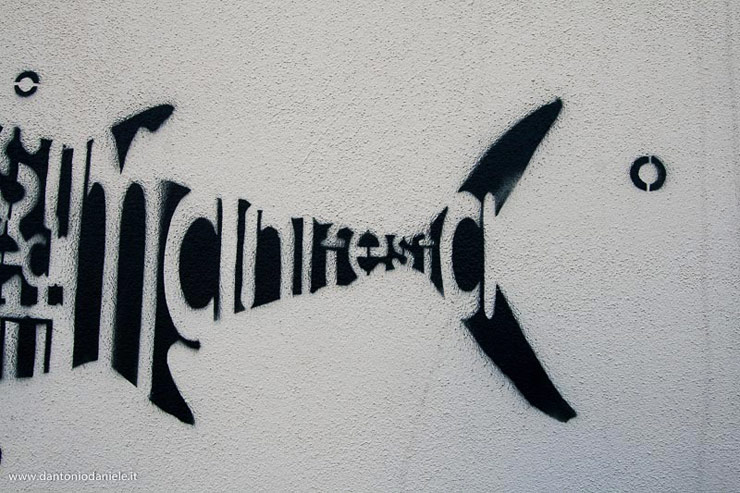 “Actually I never painted in a place where people were so happy to have me there,” he says of the new 50 square meter text based whale based on Melville’s Moby Dick. Installed over a weekend in May where Corso Tassoni meets Via Cibrario, the text comes from the book, is entitled “Ahab’s Whale”, and according to Opieme, it questions who is the bigger monster – the whale or the captain’s obsession.