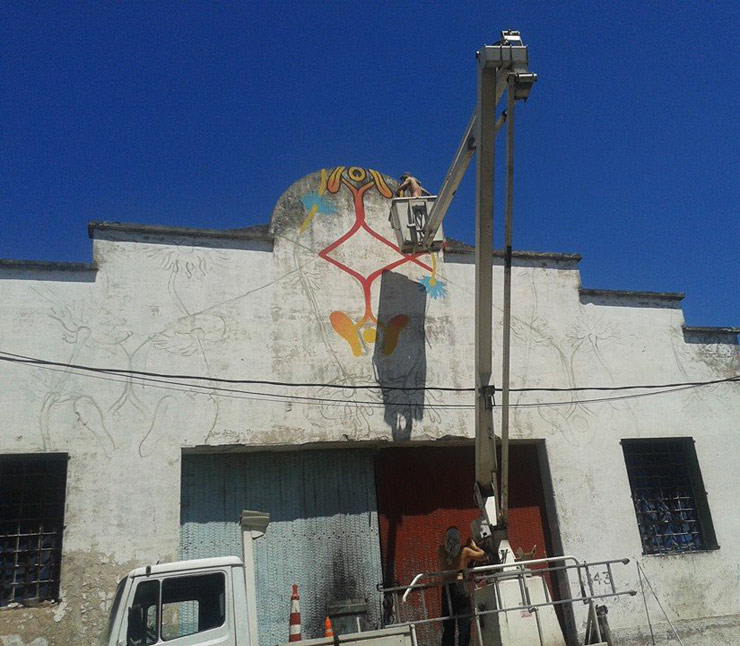There is no such thing as a Street Art “scene” here, but Gualicho liked the friendly environment where he put up his piece that mimics the repetition of decorative pattern on the walls insides some peoples homes. “I thought this work as a big wallpaper; an organic pattern of Elodeas (an algae very common on the Río de la Plata). I mixed it with other organic / abstract shapes organized over a hexagonic structure. I left the background as it was, because I love the colors that the passing of time leaves on the wall.”